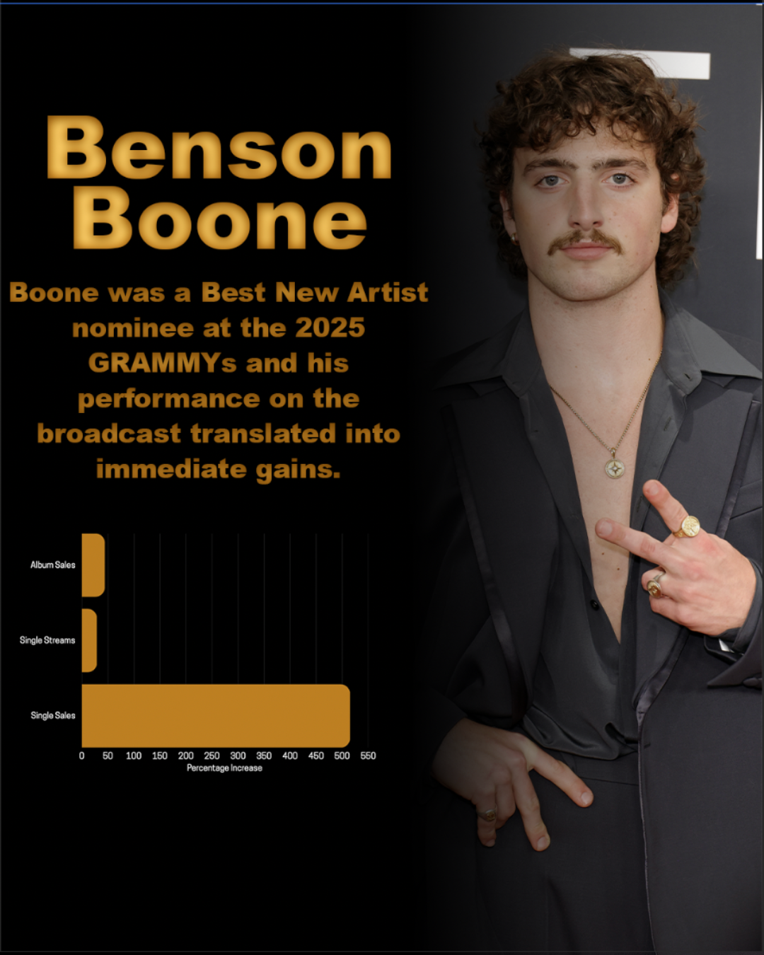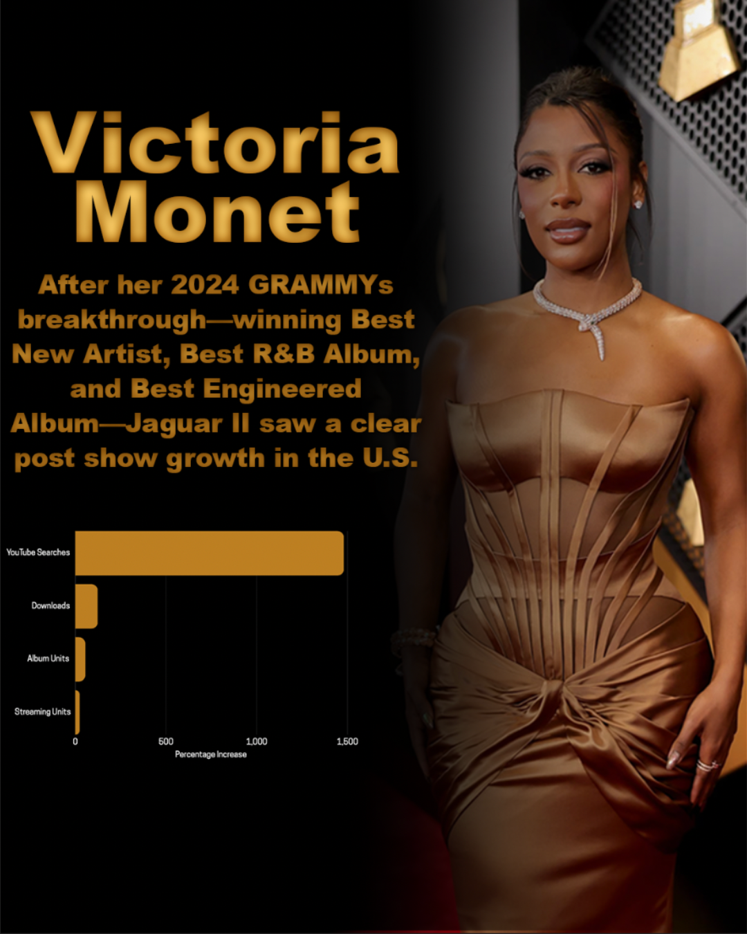 This social campaign extends the “Global Stars Overnight” concept into a series of visually cohesive posts designed for platforms like Instagram and TikTok. Each asset highlights a different artist, combining bold imagery, short-form storytelling, and simple data visualizations to show how the GRAMMYs can shift careers in real time. The campaign is designed to be scroll-stopping and digestible.